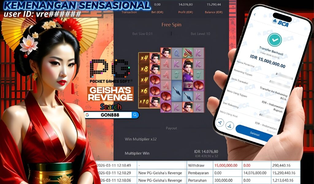 RABU, 11 MARET 2026 userID vrexxxxxx Kemenangan SENSASIONAL Pada Permainan New PG – Geisha’s Revenge Behasil Withdraw Nominal Rp15 Juta Rupiah