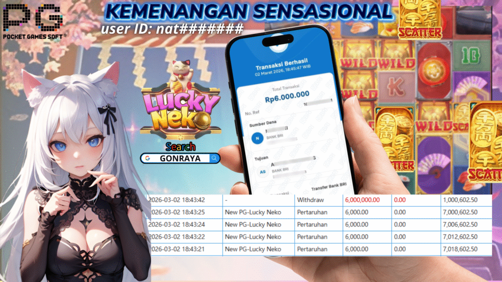 SENIN,2 MARET 2026 userID natxxxxxxx Kemenangan SENSASIONAL Pada Permainan NEW PG – Lucky Neko Behasil Withdraw Nominal Rp6 Juta