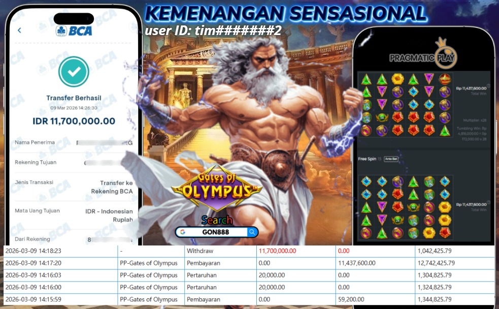 SENIN,9 MARET 2026 userID timxxxxxxx2 Kemenangan SENSASIONAL Pada Permainan PP – Gates of Olympus Behasil Withdraw Nominal Rp11,7 Juta