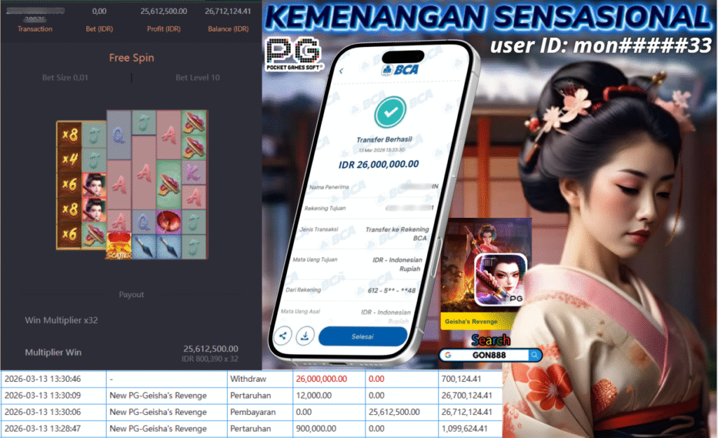 JUMAT, 13 MARET 2026 userID monxxxxx33 Kemenangan SENSASIONAL Pada Permainan New PG – Geisha’s Revenge Behasil Withdraw Nominal Rp26 Juta