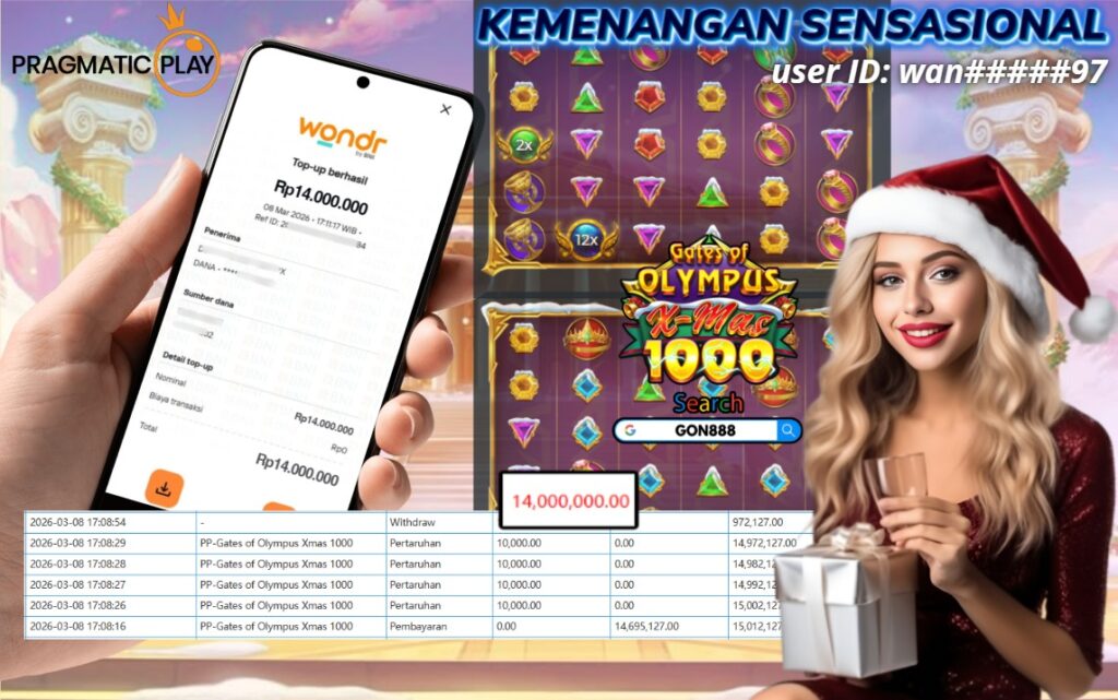 MINGGU,8 MARET 2026 userID wanxxxxx97 Kemenangan SENSASIONAL Pada Permainan PP Gates of Olympus X-Mas 1000 Behasil Withdraw Nominal Rp14 Juta