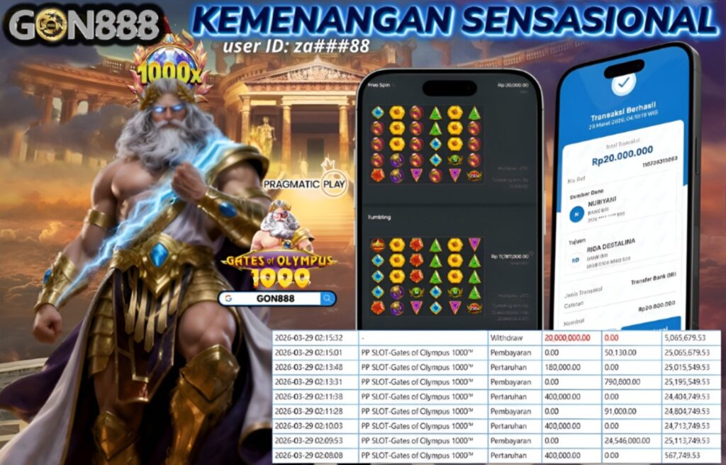 MINGGU, 29 MARET 2026 userID za****88 Kemenangan SENSASIONAL Pada Permainan PP Slot – Gates of Olympus 1000 Behasil Withdraw Nominal Total Rp20 Juta Rupiah