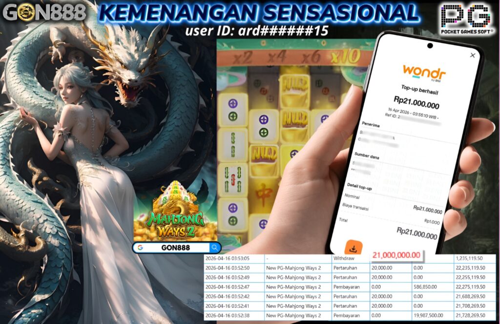KAMIS, 16 APRIL 2026 userID ard******15 Kemenangan SENSASIONAL Pada Permainan New PG – Mahjong Ways 2 Behasil Withdraw Nominal Total Rp21 Juta Rupiah