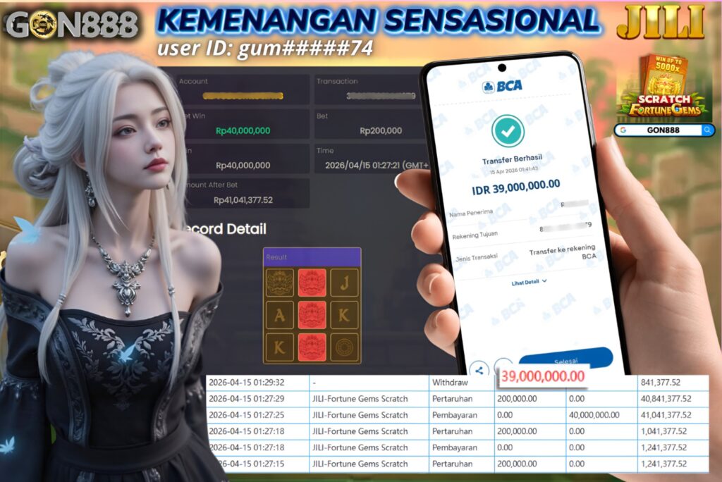 RABU, 15 APRIL 2026 userID gum*****74 Kemenangan SENSASIONAL Pada Permainan JILI – Fortune Gems Scratch Behasil Withdraw Nominal Total Rp39 Juta Rupiah