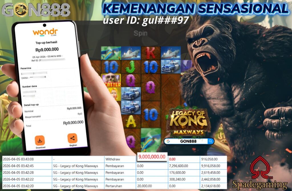 MINGGU, 5 APRIL 2026 userID gul***97 Kemenangan SENSASIONAL Pada Permainan SG – Legacy of Kong Maxways Behasil Withdraw Nominal Total Rp9 Juta Rupiah