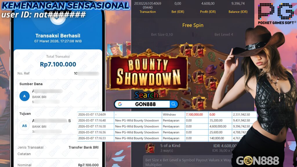 SABTU,7 MARET 2026 userID natxxxxxxx Kemenangan SENSASIONAL Pada Permainan NEW PG SLOT – Wild Bounty Showdown Behasil Withdraw Nominal Rp7,1 Juta
