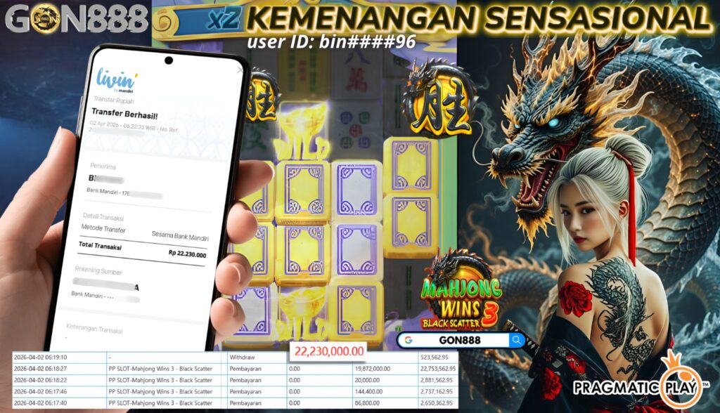 KAMIS, 2 APRIL 2026 userID bin****96 Kemenangan SENSASIONAL Pada Permainan PP SLOT – Mahjong Wins 3 Black Scatter Behasil Withdraw Nominal Total Rp22,23 Juta Rupiah