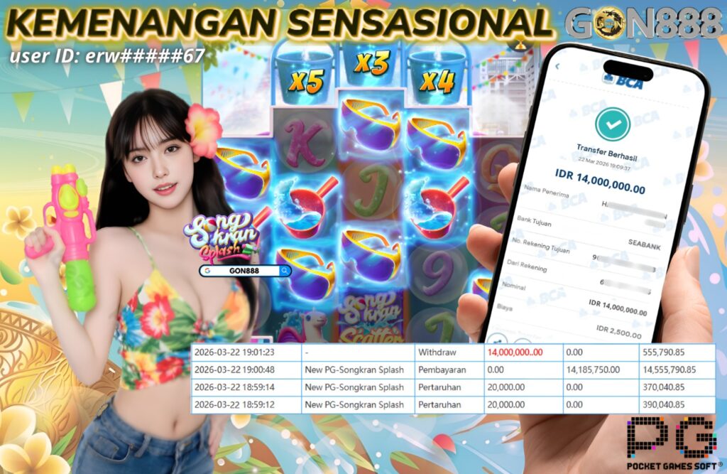 MINGGU, 22 MARET 2026 userID erw*****67 Kemenangan SENSASIONAL Pada Permainan New PG-Songkran Splash Behasil Withdraw Nominal Total Rp14 Juta Rupiah