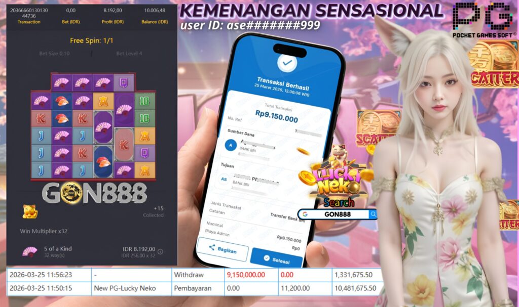RABU, 25 MARET 2026 userID ase*******999 Kemenangan SENSASIONAL Pada Permainan New PG-Lucky Neko Behasil Withdraw Nominal Total Rp9,15 Juta Rupiah
