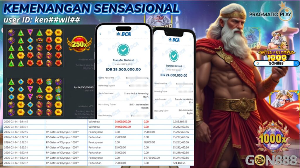 SABTU, 14 MARET 2026 userID ken**w**** Kemenangan SENSASIONAL Pada Permainan PP – Gates of Olympus 1000 Behasil Withdraw Nominal Total Rp63 Juta