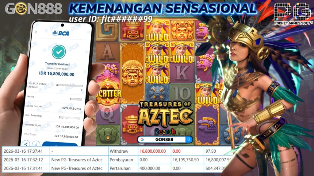 SENIN, 16 MARET 2026 userID fitxxxxxx99 Kemenangan SENSASIONAL Pada Permainan New PG-Treasures of Aztec Behasil Withdraw Nominal Total Rp16,8 Juta Rupiah