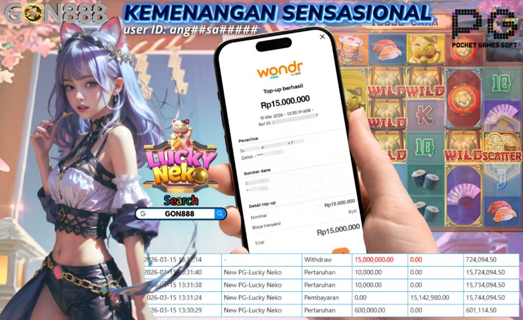 MINGGU, 15 MARET 2026 userID angxxsaxxxxx Kemenangan SENSASIONAL Pada Permainan New PG-Lucky Neko Behasil Withdraw Nominal Total Rp15 Juta Rupiah